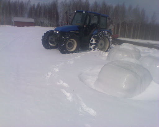 -13.3 aamusella. Kävin kahtoon, että ovatko rusakot syöneet paaleihin reikiä. Etupää pysyy pinnalla, on vielä sen verran hankiaista :)